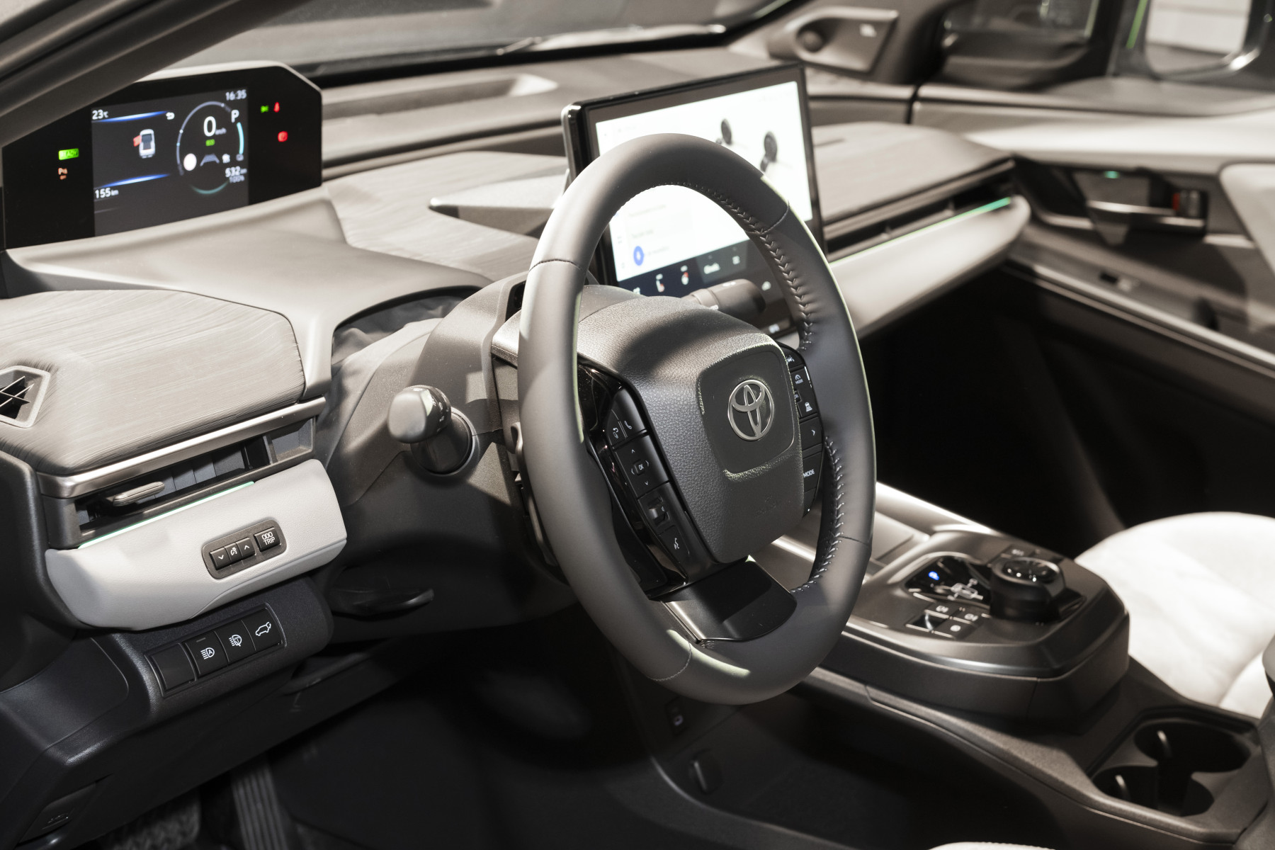 El habitáculo del Toyota C-HR+ Electric está diseñado para combinar ergonomía y tecnología con un enfoque sostenible. Los materiales reciclados (como el PET empleado en tapicerías y revestimientos) y las opciones de tapizado en cuero sintético o ante sintético subrayan la apuesta por la sostenibilidad. El maletero ofrece 416 litros de capacidad, y el techo panorámico, la iluminación ambiental de 64 colores y la climatización por bomba de calor completan un entorno moderno y confortable.
