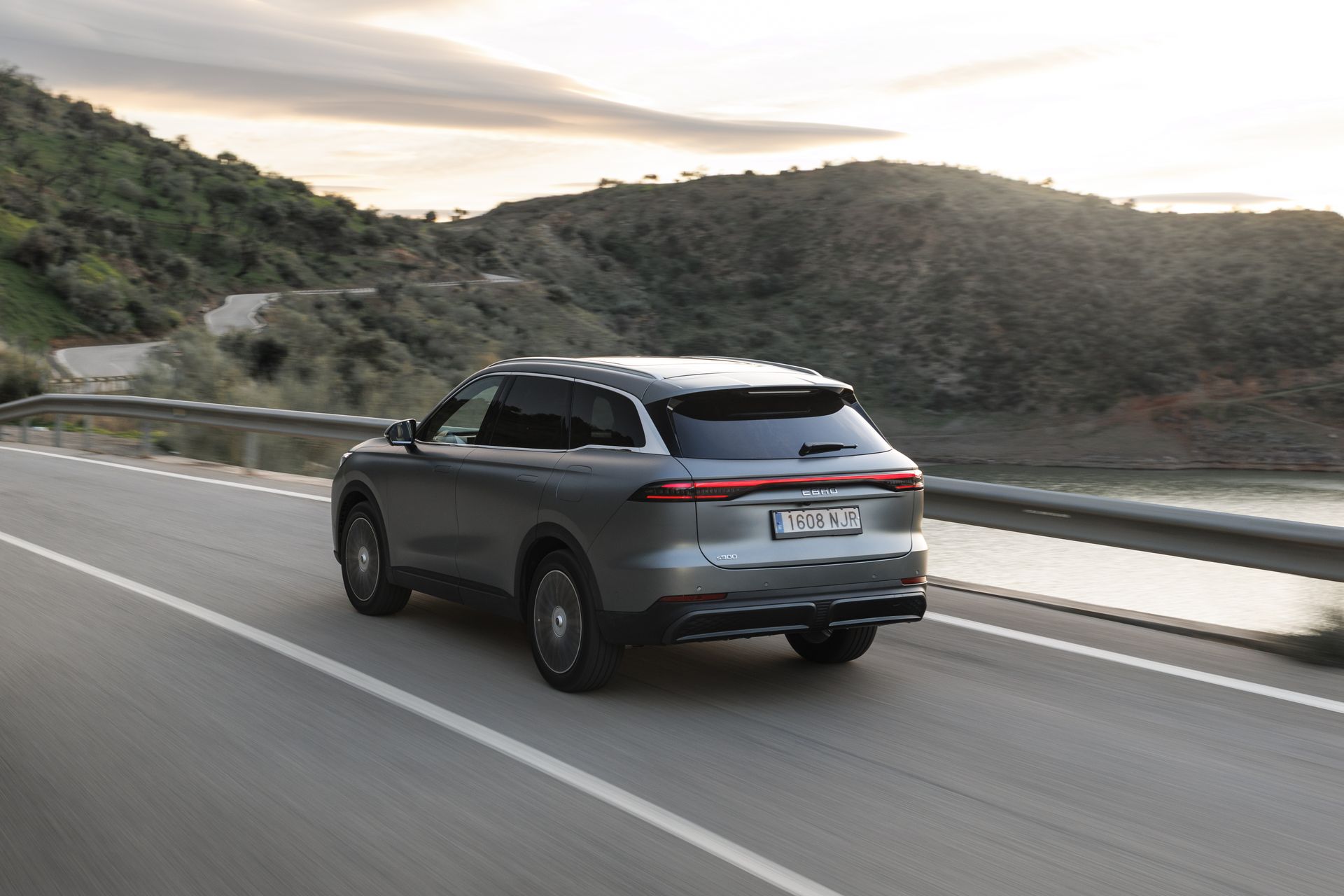 A nivel de diseño, EBRO busca presencia sin caer en lo extravagante. El frontal lo domina una gran parrilla con acabado diamantado en negro mate, flanqueada por faros Full LED con intermitentes dinámicos y una firma DRL tridimensional. En el perfil aparecen llantas de 20 pulgadas, manetas retráctiles, cristales traseros oscurecidos y pilares en negro brillo; y el techo panorámico (1,1 m²) suma luz y sensación de amplitud. Detrás remata con pilotos “coast-to-coast” con animación dinámica y un paragolpes musculoso, también con patrón diamantado.