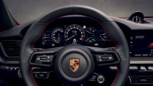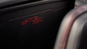 El interior sigue exactamente esa misma lógica. El coche se fabrica como biplaza, con asientos Sports Plus regulables en cuatro posiciones de serie, aunque pueden sustituirse por baquets ligeros con carcasa de fibra de carbono, respaldo abatible, airbag de tórax integrado, regulación eléctrica en altura y ajuste longitudinal manual. Hay alfombrillas ligeras, paneles de puerta aligerados y tiradores de fibra de carbono, mientras que el acabado de serie utiliza piel negra también en parasoles y pilar A, con el logotipo GT3 S/C bordado en la zona trasera. El arranque se mantiene fiel a la tradición Porsche, con mando giratorio a la izquierda del volante, y la instrumentación digital incorpora una función Track Screen que reduce la información lateral para dejar sólo los datos esenciales sobre neumáticos, aceite, refrigerante y combustible. Incluso el cuentarrevoluciones puede configurarse para situar el límite de las 9.000 rpm en posición de las 12 en punto, un gesto que revela hasta qué punto Porsche ha querido conservar el ritual del GT3 también en esta nueva carrocería.